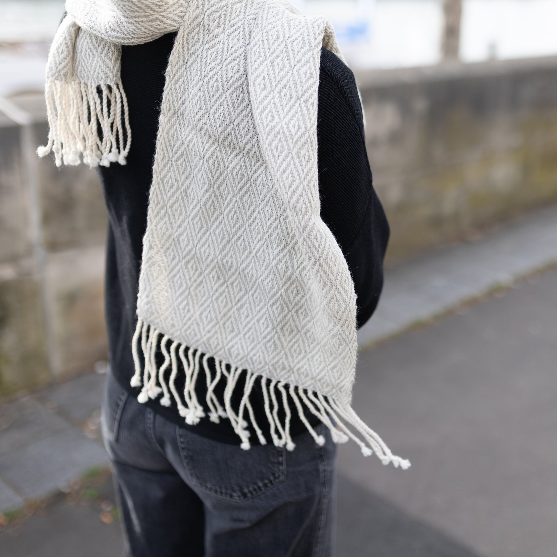 Nous adorons les écharpes en alpaga 🦙. Légères comme les herbes de l'Altiplano et douces comme la brise chaude du désert. Ce modèle, avec son motif œil-de-perdrix en noir et blanc et ses jolies franges, mesure 30 cm de large et 207 cm de long, offrant une grande polyvalence pour envelopper votre cou de différentes manières. Unisexe et élégante, elle incarne la grâce du camélidé andin et s'adapte à tous les styles modernes.