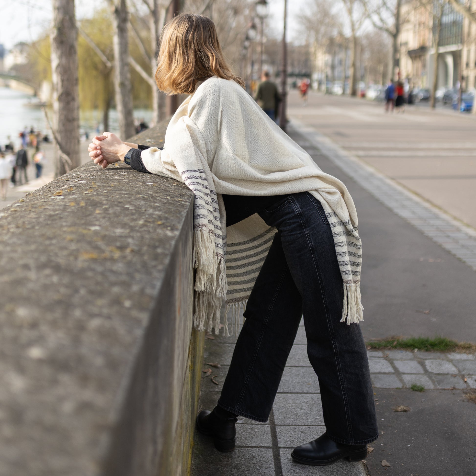 Ce modèle en teinte écrue est rehaussé de jolies rayures au bord inférieur, terminé par une frange délicate. Avec ses dimensions généreuses de 170 x 140 cm, elle se porte de multiples façons : drapée, croisée, pliée ou simplement jetée sur les épaules, enveloppant comme une douce étreinte de la brise chaude des hauteurs andines.